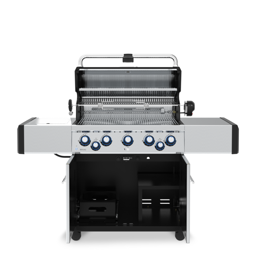 Le barbecue Broil King Regal S590 PRO IR est un barbecue idéal pour ceux qui recherchent une grande surface; avec ses 625 pouces carré de surface de cuisson en acier inoxydable, ainsi qu’une grille de réchaud en acier inoxydable. Ses 55000 btu sont répartis sur 5 brûleurs en acier inoxydable garantis 15 ans, il comprend aussi un brûleur arrière de rôtisserie, de 15000 btu, avec son ensemble de tournebroche et un brûleur latéral de saisie infrarouge de 10000 btu. Ses tablettes sont fixes et en acier inoxydable. Son couvercle est en acier inoxydable, facile d’entretien, reste beau très longtemps et garde bien sa chaleur. Avec le Broil King Regal S590 PRO IR vous combinerez performances et durabilité. Vous pourrez cuisiner à toute heure grâce à sa lumière de poignée fonctionnant au DEL. Fonctionne au gaz propane.