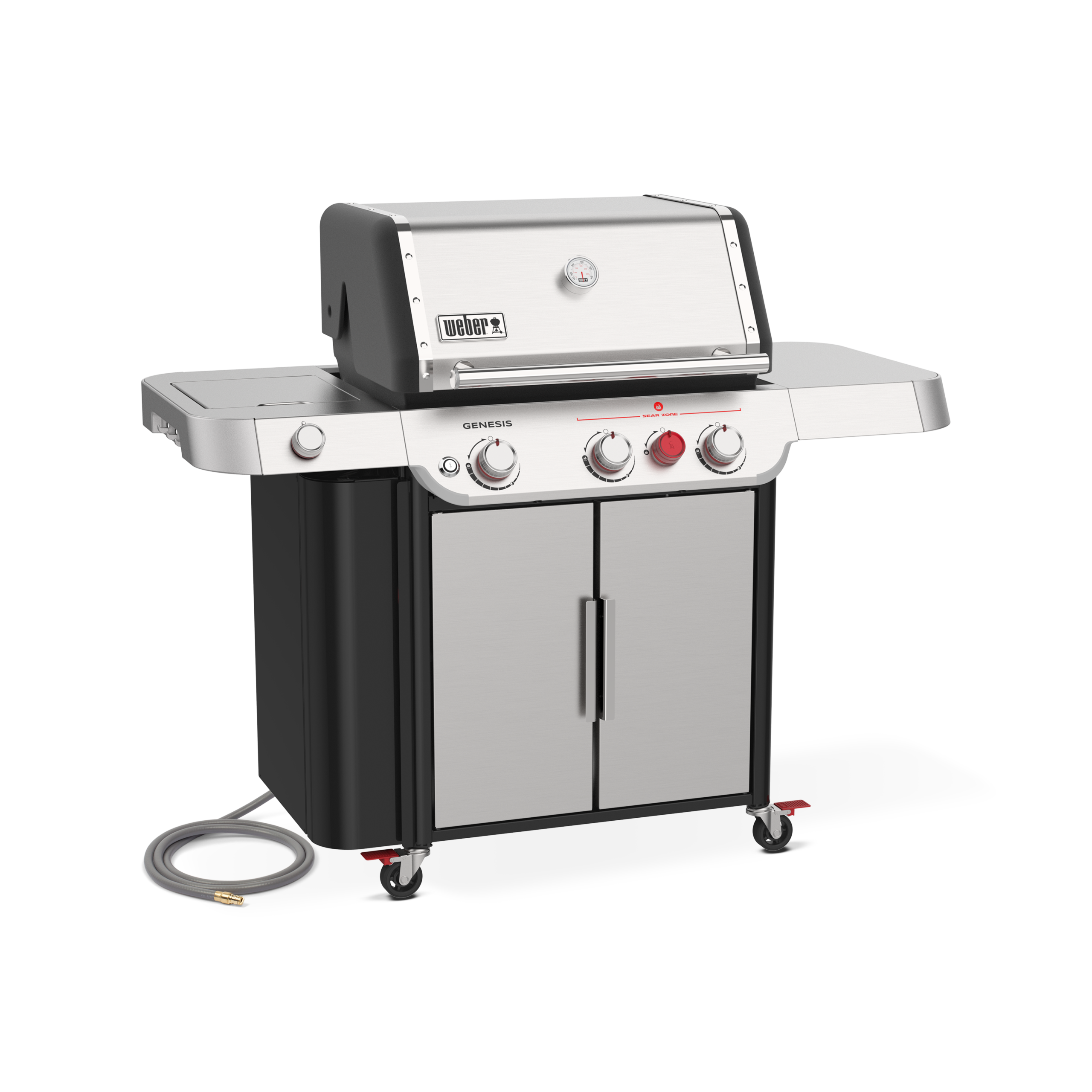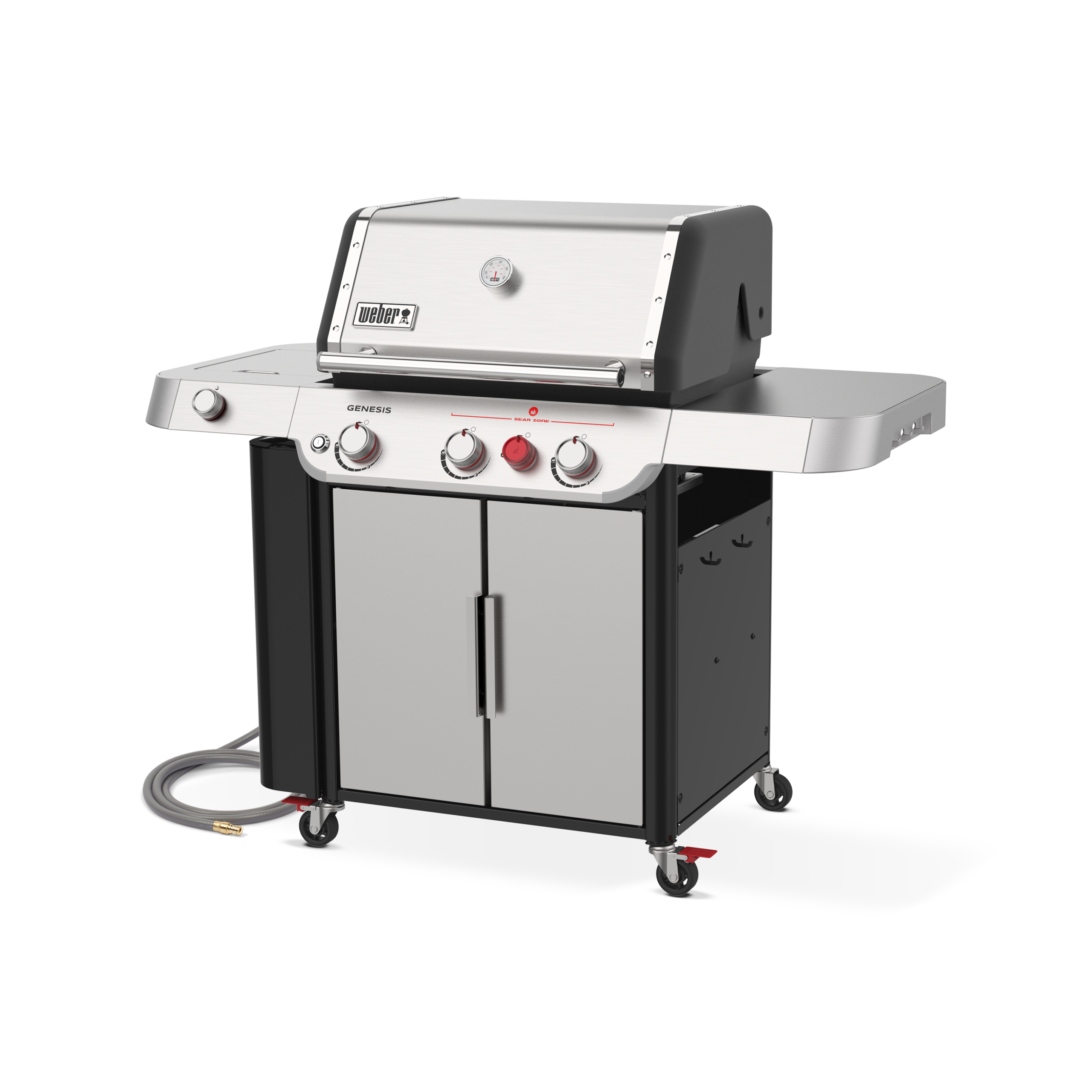 Le Weber Genesis édition Premium SP E-335 fonctionnant au gaz naturel, inclus 3 brûleurs principaux en acier inoxydable garantis 10 ans, une surface de cuisson de 513 pouces carrés en acier inoxydable 9mm et d’une grille de réchaud de 156 pouces carrés. Les déflecteurs sont en acier inoxydable. Le couvercle est en acier inoxydable et le chariot en acier est protégé par une peinture cuite. Ce bbq dispose aussi de 4 roues directionnelles.